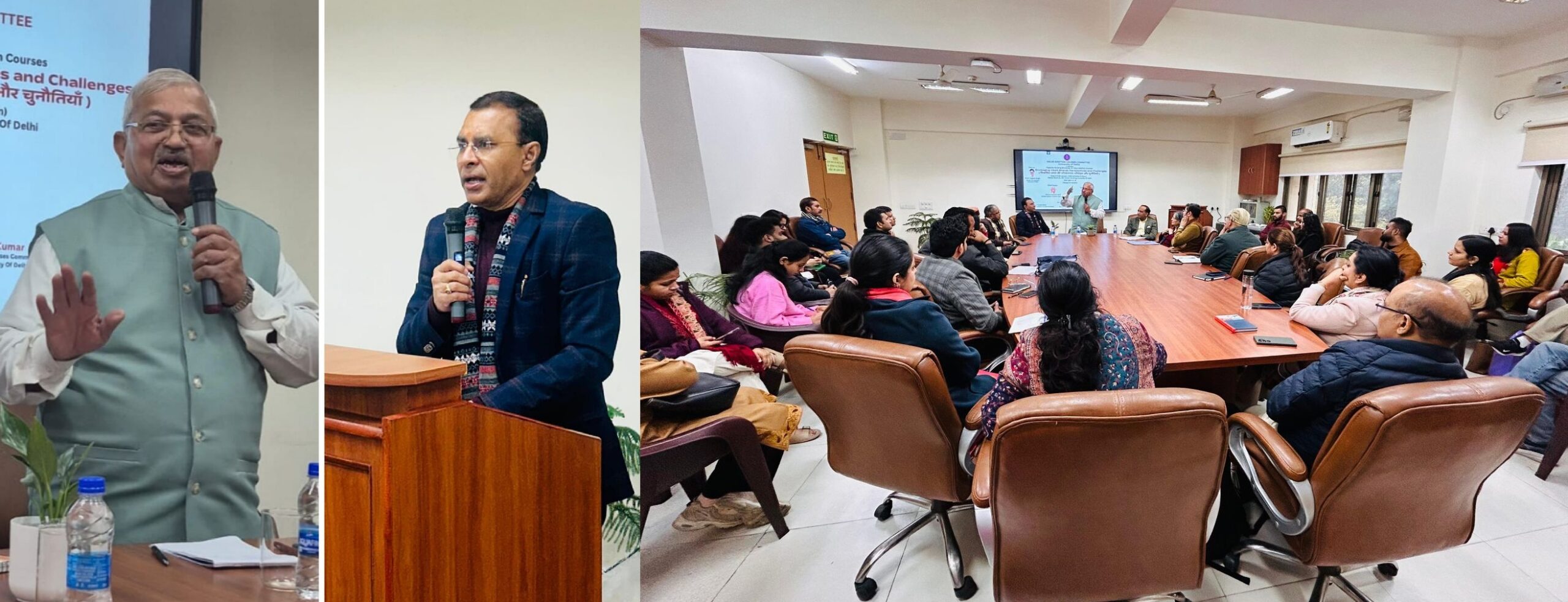 नई दिल्ली. दिल्ली विश्वविद्यालय की मूल्य संवर्धन पाठ्यक्रम समिति द्वारा ‘विकसित भारत की परिकल्पना: परिप्रेक्ष्य और चुनौतियां’ विषय पर दो दिवसीय क्षमता संवर्धन कार्यशाला का आयोजन 27-28 जनवरी को किया गया. दिल्ली विश्वविद्यालय के विभिन्न महाविद्यालयों में पढ़ाने वाले शिक्षकों के लिए आयोजित इस कार्यशाला के उद्घाटन सत्र को मूल्य संवर्धन पाठ्यक्रम समिति के अध्यक्ष प्रो. निरंजन कुमार ने संबोधित किया. विकसित भारत पर चर्चा करते उन्होंने प्रश्न उठाया कि क्या भारत पहले एक विकसित राष्ट्र नहीं था? फिर तथ्यों के साथ उन्होंने बताया पहली से लेकर 16वीं-17वीं तक भारत एक विकसित राष्ट्र के रूप में जाना जाता था. और एक बार फिर वर्तमान समय में भारत प्रधानमंत्री नरेंद्र मोदी के नेतृत्व में विकसित राष्ट्र बनने की ओर अग्रसर है. प्रधानमंत्री मोदी ने समृद्धि के साथ-साथ संस्कारयुक्त जिस विकसित भारत की परिकल्पना प्रस्तुत की है, उसी को ध्यान में रखकर दिल्ली विश्वविद्यालय में विशेष पाठ्यक्रम तैयार किया गया है.